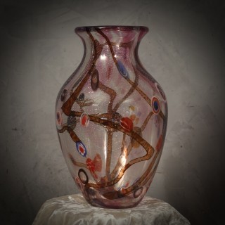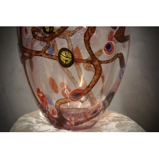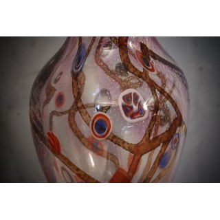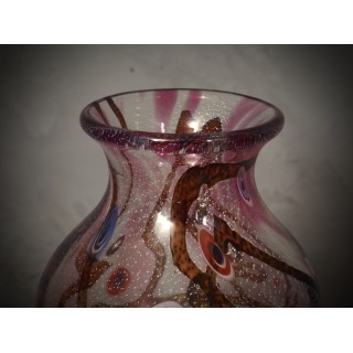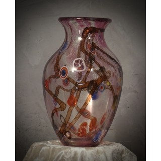 Fantastico vaso della vetreria di Murano, sia per la sua particolare lavorazione che per il colore, infatti il vaso è di colore rosa trasparente con tante murrine all'interno del vetro.