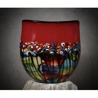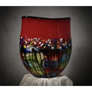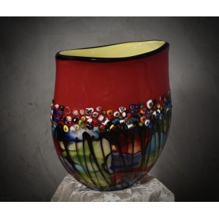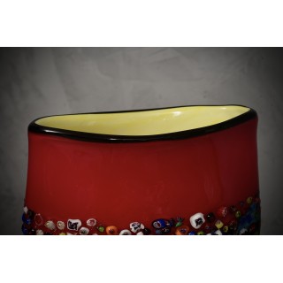 Murano vase, with particular workmanship all around. Vase with a very narrow oval section, with a particular manual workmanship with Murrine arranged along its entire surface. Due to its heaviness and the thickness of the glass it seems almost "submerged". Instead, it is "incamiciato" which means that the workmanship is very similar, but that it is two double-blown glasses of different colours, in this case red and yellow in glass paste. Note the large quantity of murrine along the surface of the vase. Refinement and class as is the Murano style, unique pieces that always remain precious. Misure ( 15 x 32, H 32 ) Inches ( 6 x 13, H 13 ).