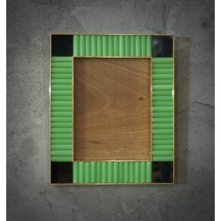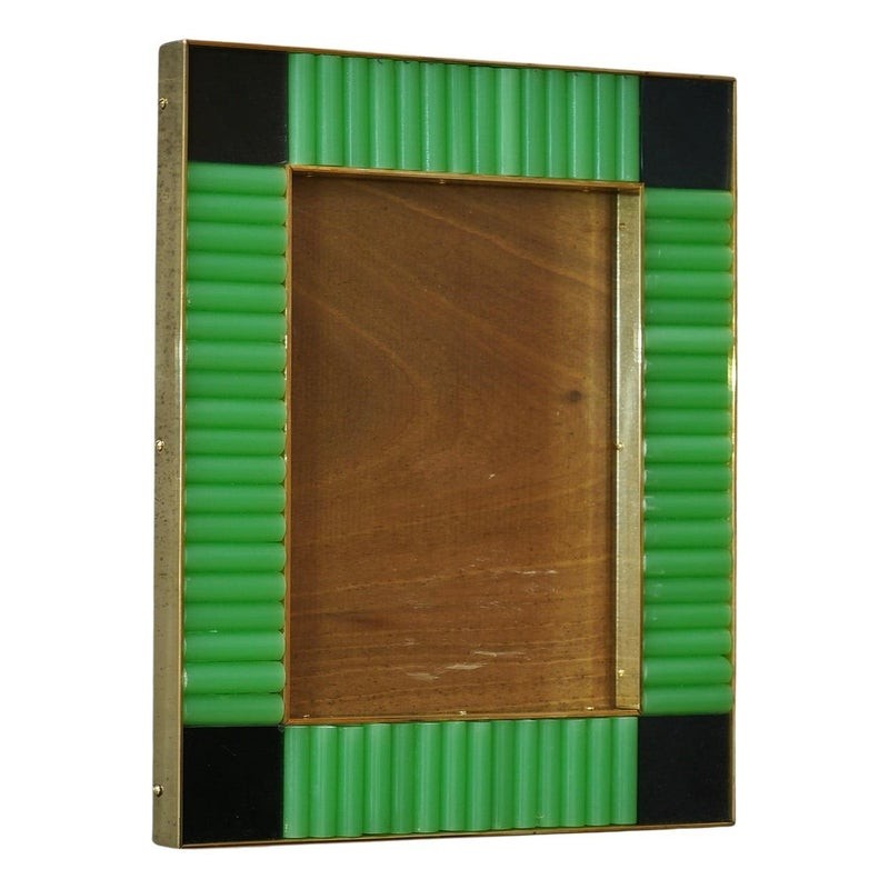 The structure of the picture frame is made of wood, its internal and external perimeter has been edged with narrow brass moldings; inside there are green glass rods; small black glass has been inserted in the four corners. Created for our Hannauroma store, the picture frame are unique and original in their kind. The Murano furnaces create an indisputable and timeless design, simple but elegant at the same time. Misure ( 28 x 23, ) Inches ( 11 x 9, ).
