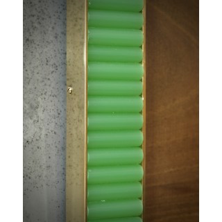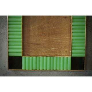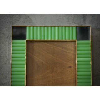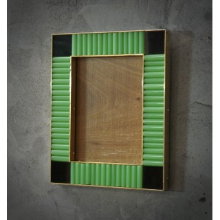 La struttura della cornice è in legno, il suo perimetro interno ed esterno è stato bordato con strette modanature in ottone; all'interno sono presenti delle bacchette di vetro verde; ai quattro angoli sono stati inseriti dei piccoli vetri neri. Creati per il nostro negozio Hannau Roma, i porta quadri sono unici e originali nel loro genere. Misure ( 28 x 23, ) Inches ( 11 x 9, ).