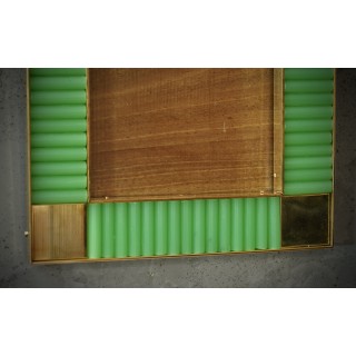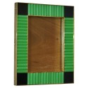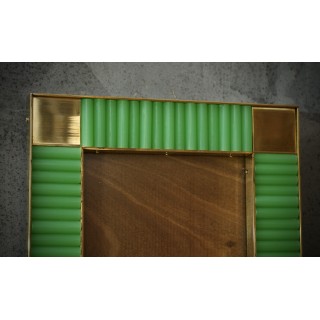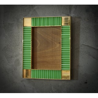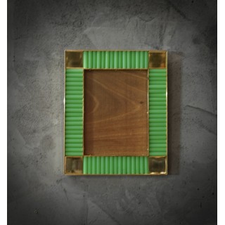 The structure of the picture frame is made of wood, its internal and external perimeter has been edged with narrow brass moldings; inside there are green glass rods; small polished brass squares have been inserted at the four corners. Created for our Hannauroma store, the picture frames are unique and original in their kind. The Murano furnaces create an indisputable and timeless design, simple but elegant at the same time. Misure ( 28 x 23, ) Inches ( 11 x 9, ).