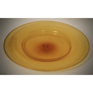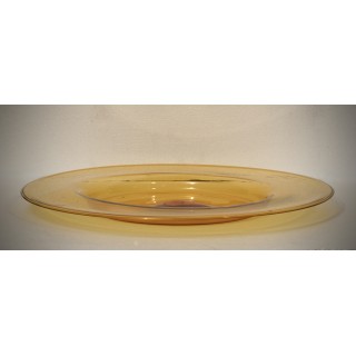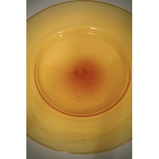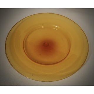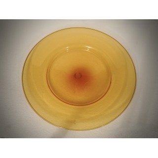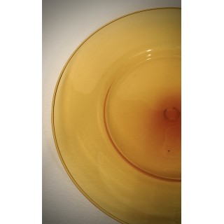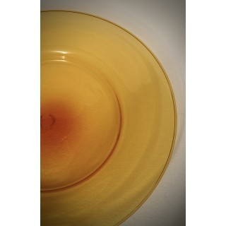 A highly sought-after plate from the 1920s with an orange background, handcrafted in the Murano furnaces. The plate is made of glass paste with a transparent orange background; it is large in size and fills the center of the table very well, it is very fine and very light for its size. These shades are highly sought-after, and are very beautiful and characteristic of that period of time. Very simple shapes in the rhythm and harmony of these lines, created to highlight lightness and clear transparency in the most subtle, almost evanescent hues, the two extraordinary qualities of Murano blown glass, constitute the essential traits of the new school, whose initiators were Venini & Cappelin, in collaboration with an exquisite Murano artist, Vittorio Zecchin". Misure ( diametro 50 ). Inches ( diameter 20 ).