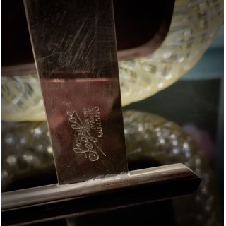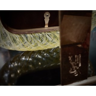 Brass structure, with large round edge in yellow Murano glass. The glass edge is the classic work of the 70s. The glass is transparent "torchon" with thread in different shades of yellow, as can be seen in the photos. Perfect portrait size, it is supported at the back by a brass fin, where the signature is marked. Misure ( 26 x 21 ) Inches ( 10 x 8 ).