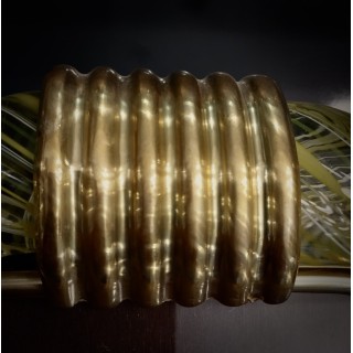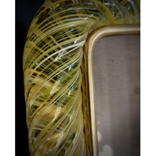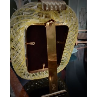 Struttura in ottone, con ampio bordo rotondo in vetro di Murano giallo. Il bordo in vetro è la classica lavorazione degli anni '70. Il vetro è trasparente "torchon" con filo in diverse tonalità di giallo, come si può vedere nelle foto. Perfetta per un ritratto, è sostenuta sul retro da una pinna in ottone, dove è marchiata la firma. Misure ( 26 x 21 ) Inches ( 10 x 8 ).