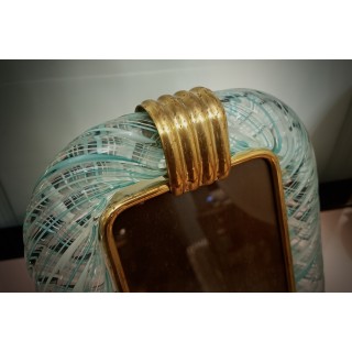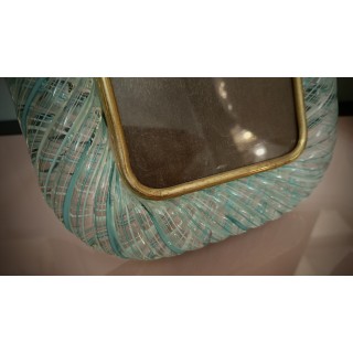 Cornice in ottone, con ampio bordo rotondo in vetro di Murano color acquamarina e bianco. Il bordo in vetro è la classica lavorazione degli anni '50. Il vetro è "torchon" trasparente con fili in diverse tonalità di verde e bianco. Perfetta per un ritratto, è sorretta sul retro da una pinna in ottone, dove è marchiata la firma. Misure ( 25 x 20 ) Inches ( 10 x 8 ).