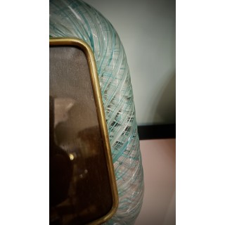 Brass frame, with large round edge in Murano glass colored aquamarine and white. The glass edge is the classic work of the 50s. The glass is transparent "torchon" with threads in different shades of green and white, as can be seen in the photos. Perfect portrait size, it is supported at the back by a brass fin, where the signature is marked. Filigrana glass is made of glass with milky threads. This type of glass can be divided into 3 other types. First, the retortoli filigrana, in which milky threads are intertwined. Secondly, reticello filigrana, whose threads form rhombuses and each of them has an air bubble trapped inside. Thirdly, there is filigrana a fili, in which the filaments are all straight and parallel or spiral. Filigrana dates back to the 16th century. It is also one of the most characteristic types of Murano glass. Misure ( 25 x 20 ) Inches ( 10 x 8 ).