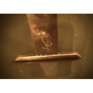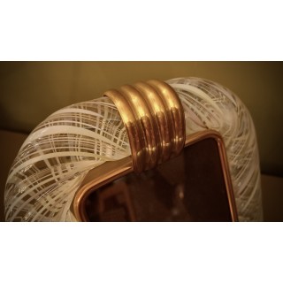 Struttura in ottone, con un ampio bordo rotondo in vetro di Murano trasparente. Il bordo in vetro è la classica lavorazione degli anni '70. Il vetro è trasparente "torchon" con filo in diverse tonalità di bianco, come si può vedere nelle foto. Perfetto per il ritratto, è sostenuto sul retro da una pinna in ottone, dove è marchiata la firma. Misure ( 25 x 20 ) Inches ( 10 x 8 ).