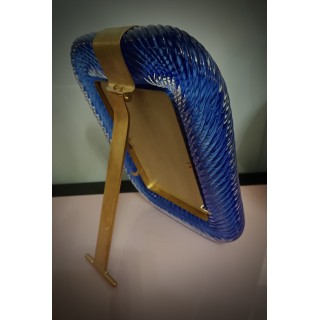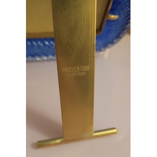 Brass structure, with a large round edge in blue Murano glass. The glass edge is the classic workmanship of the 70s. The glass is transparent "torchon" with an internal blue color, as can be seen in the photos. Perfect for the portrait, it is supported on the back by a brass fin, where the signature is marked. Misure ( 28 x 23 ) Inches ( 11 x 9 ).