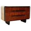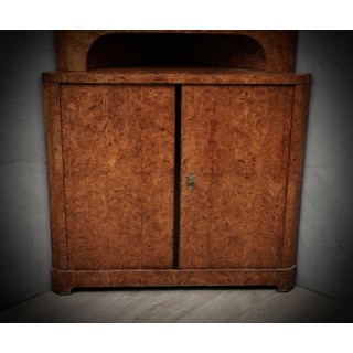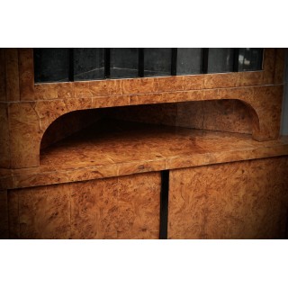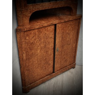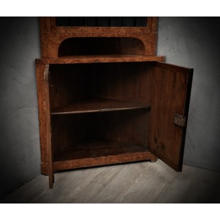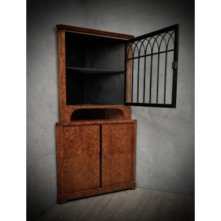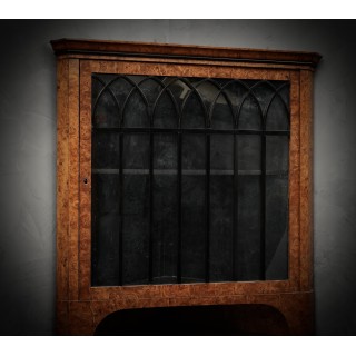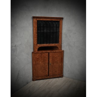 Credenza angolare tutta lastronata in radica di pioppo. La parte inferiore è chiusa da uno sportello con una piccola chiave, e in alto a sinistra esposta da uno sportello con vetro e finiture neogotiche laccate in gommalacca nera. L'interno è laccato nero. In perfette condizioni se si pensa che il pezzo è dei primi anni del 1800. La credenza angolare è divisibile in due parti, quella superiore e quella inferiore, quindi anche facilmente trasportabile. Misure ( 70 x 70, H 198 ). Inches ( 28 x 28, H 79 ).