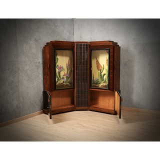 Credenza angolare attribuita a Marcello Piacentini, importante mobile italiano impiallacciato in noce, da notare il suo design unico e i due dipinti interni, finemente dipinti.