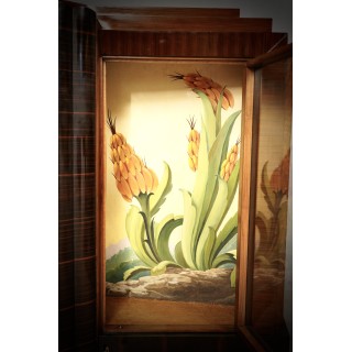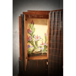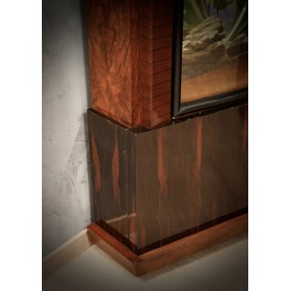 Corner cupboard formed by four doors, two high and two low; the two high doors internally have two wonderful paintings, exquisitely crafted; Its beauty lies in the fact that it can be illuminated internally, thus achieving a very romantic effect. The two internally lit paintings are truly unique; this is precisely his strong point. To note its particular design, both in the central part with the movement of the Macassar wood, and in the side parts with the two large doors and its interior paintings. The corner cupboard rests on copper feet of particular design. It is well finished even internally in the two low doors. The bulbs are inserted in the central part and hidden by a colored glass. A mobile unique. Coming from an important Roman house. ( 130x130, H 175 ). Inches (51x51, H 69).