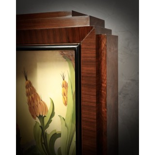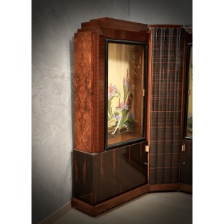 Credenza angolare formata da quattro ante, due alte e due basse; le due ante alte internamente hanno due meravigliosi dipinti, squisitamente lavorati; la sua bellezza sta nel fatto che può essere illuminata internamente, ottenendo così un effetto molto romantico. I due dipinti illuminati internamente sono davvero unici. Da notare il suo design particolare, sia nella parte centrale con il movimento del legno di Macassar, sia nelle parti laterali con le due grandi ante e i suoi dipinti interni. La credenza angolare poggia su piedini in rame dal design particolare. ( 130x130, H 175 ). Inches (51x51, H 69).