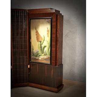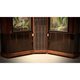 Corner cupboard attributed to Marcello Piacentini, important Italian furniture veneered in walnut and Macassar/ebony wood, to note its unique design and the two interior paintings, finely painted.