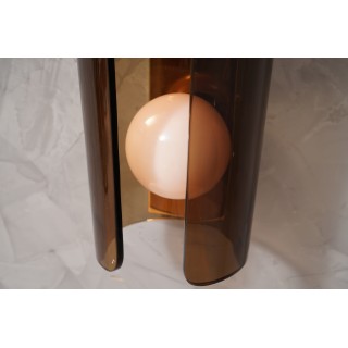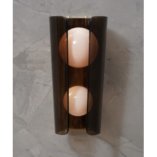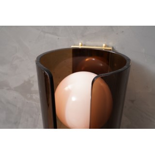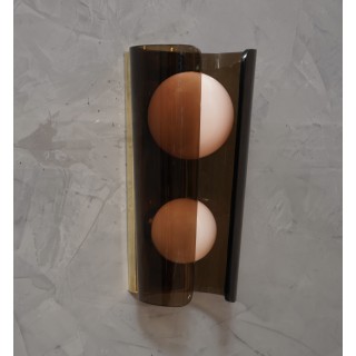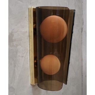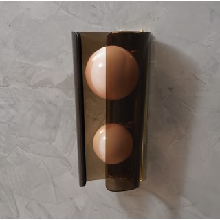 The applique is formed by a rectangular brass structure, to which a large and thick curved brown glass is attached. The brown glass was made from a large vessel that was intricately cut and shaped. Two pale pink glass spheres have been inserted inside, which contain a light on each side. Truly one of a kind design for this special Murano glass applique. Aesthetically it is wonderful, noting that the brown glass is conical and not cylindrical, therefore the two pink spheres inside are one smaller and one larger. The applique has a very high architectural elegance. Misure ( 23 x 25, H 45 ) Inches ( 9 x 10, H 18 ).