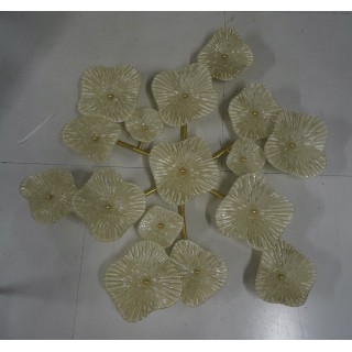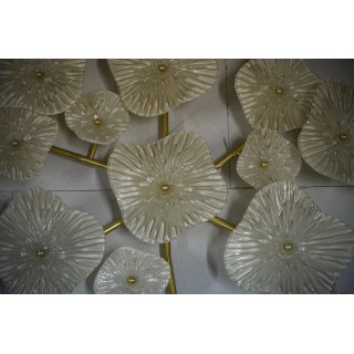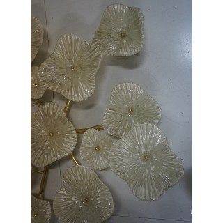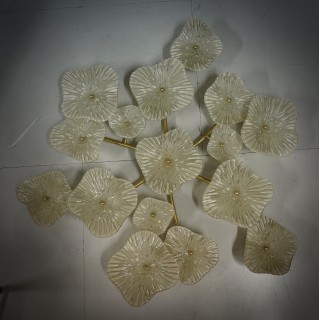 The wall light/chandelier has a brass structure, in the shape of a climbing plant, which is completely removable. Pearl white Murano glass plates are mounted above the brass structure, their shape reminiscent of blooming flowers. The structure has a central disk from which six brass arms unfold, each with 2/3 light points covered with pearl white Murano glass plates. There are fifteen light points, which have G9 wiring. Refinement and class as is the Murano style, unique pieces that always remain precious. When turned on, the lamp is very bright, having fifteen bulbs with G9 lamp holders, it will illuminate your home perfectly. Misure ( diametro 135, H 18 ). Inches ( diameter 53, H 7 ).