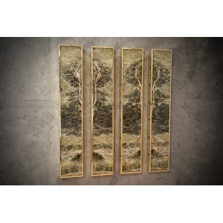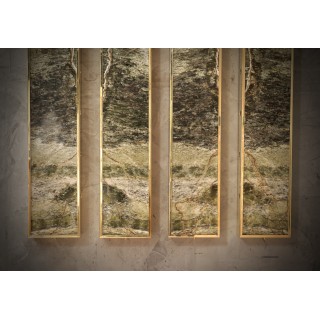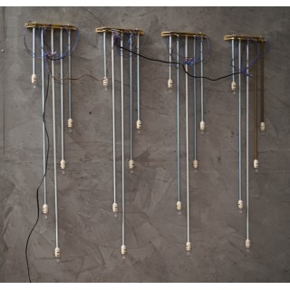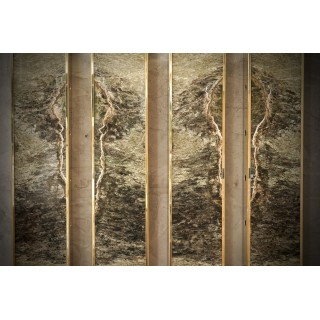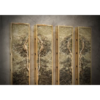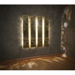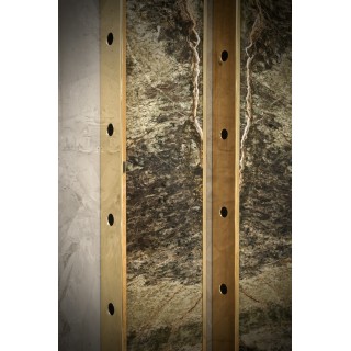 L'applique è composta da una struttura in ottone che ne ricopre l'intero perimetro. Centralmente è stato inserito un pregiatissimo marmo irlandese dalle venature eleganti. Lungo i lati lunghi della fascia in ottone della struttura sono presenti sei fori circolari che lasciano passare la luce lateralmente. L'applique ha quindi una diffusione laterale della luce come se fossero raggi di luce, come si può vedere dalle foto. Misure ( 22 x 8, H 125 ). Inches ( 9 x 3, H 49 ).