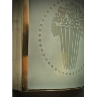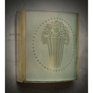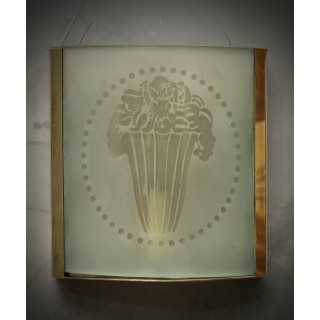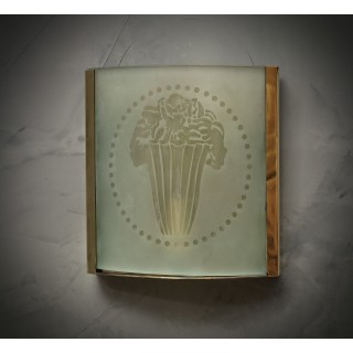 The pair of applique has a brass structure, in the shape of a parallelepiped, only one of the sides has been inserted a sandblasted glass with a design of a vase, classic of the time. Internally it has a light bulb. Pair of niche objects and highly sought after, for their perfect workmanship. (Cm19x21). Inches (7 x 8).
