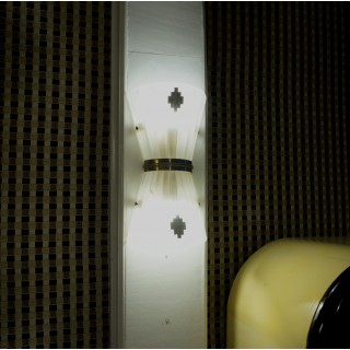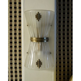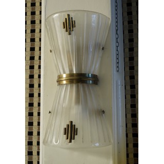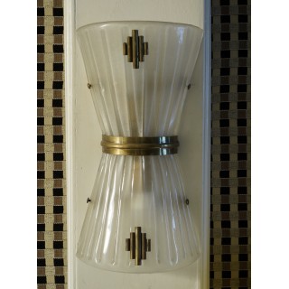 The applique have a brass structure, and two conical half shells in Murano glass have been placed on top. The shells are opposite each other, with the smaller parts meeting in the center. The whole is finished with small brass inserts, both in the center of the applique and in the middle of the shells. They carry two bulbs, one below and one above.