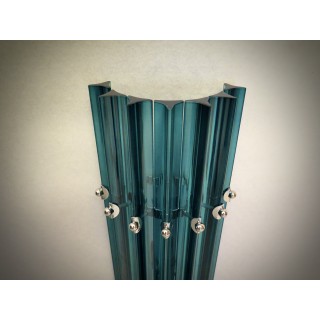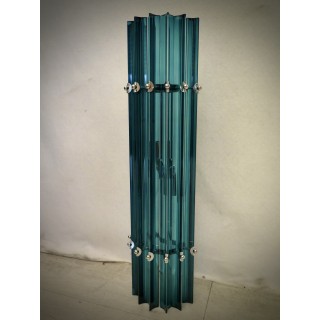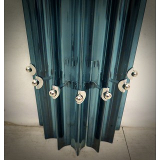 Tutto in pregiato vetro di Murano. Hanno una struttura semicircolare in metallo cromato; poi tutto intorno sono state inserite una serie di canne di vetro triangolari in colore blu cobalto. Raffinatezza e classe come nello stile di Murano, pezzi unici nel loro genere che rimangono preziosi per sempre. Quando accesa, la lampada da parete è molto luminosa avendo due lampadine con un piccolo portalampada, illuminerà perfettamente la tua casa. Cm (70 x 18). Inches (27 x 7).