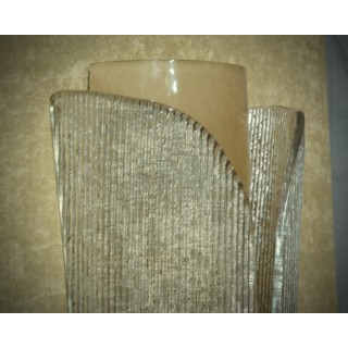 The applique is made up of two glasses, one underlying a semi-cylindrical shape, while the other superimposed on the first with a shaped shape and striped design. Misure (28 x 16, H53). Inches (11 x 6, H 21).