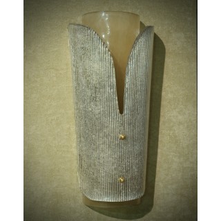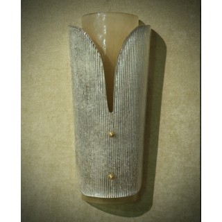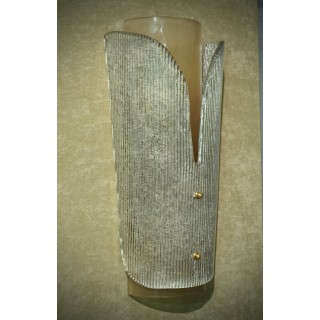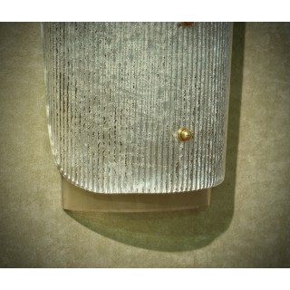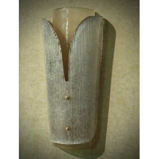 L'applique è composta da due vetri, uno sottostante a forma semi cilindrica, mentre l'altro sovrapposto al primo con forma sagomata e disegno rigato. Misure (28 x 16, H53). Inches (11 x 6, H 21).