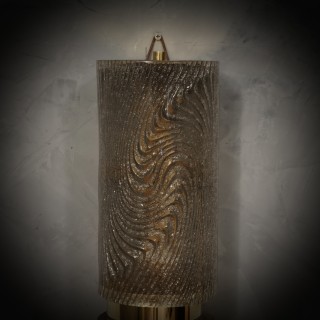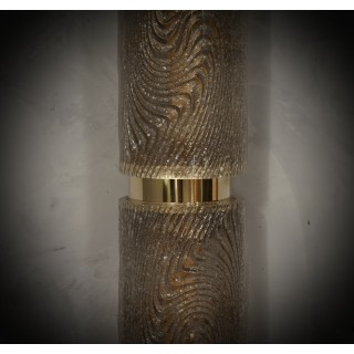 L'applique è formata da una struttura in metallo color oro che permette l'alloggiamento sovrapposto di due bellissime piastrelle in vetro di Murano color tortora. Il design è molto pulito e semplice, ma allo stesso tempo dona all'applique un'eleganza molto raffinata. La sua struttura in ottone lucido lo rende molto ricco. La lavorazione del vetro è molto bella, conferendo alle due piastre in vetro sovrastanti un aspetto molto prezioso e rifinito. Raffinatezza e stile come è nello stile muranese di quel periodo, pezzi unici nel loro genere e pezzi che restano sempre preziosi. Misure ( 15 x 13, H 60 ) Inches ( 6 x 5, H 24 ).