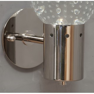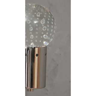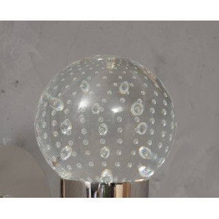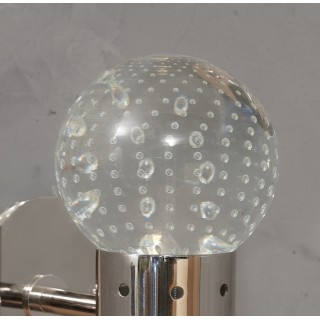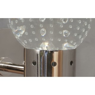 Le applique sono costituite da una struttura in acciaio che permette il ribollire di bellissime sfere in vetro di Murano di colore trasparente. Il design è molto pulito e semplice, ma allo stesso tempo dona all'applique un'eleganza molto raffinata. La sua cornice in acciaio lucido lo rende molto ricco con un cono color acciaio che permette poi l'alloggiamento della sfera trasparente. La sua installazione a parete è resa possibile per mezzo di un piccolo rosone presente sul tubo orizzontale. Raffinatezza e stile come è nello stile muranese di quel periodo, pezzi unici nel loro genere e pezzi che rimangono sempre preziosi. Misure ( 10 x 18, H 19 ) Inches ( 4 x 7, H 8 ).