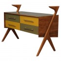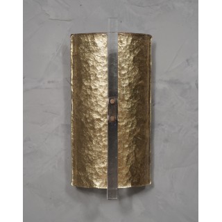 L'applique è composta da un bellissimo vetro liscio e curvato a formare un semicerchio. Il vetro è stato dorato nella parte posteriore, molto bello e resistente. Sopra questo vetro curvo è stato posto uno stretto e lungo parallelepipedo in vetro trasparente, che rende l'applique ancora più bella nel suo disegno, è fissato da due viti in ottone. La struttura a cui è fissato il vetro è in ottone brunito e i due portalampade sono color oro. Misure ( 20 x 11, H 43 ) Inches ( 8 x 4, H 17 ).