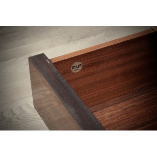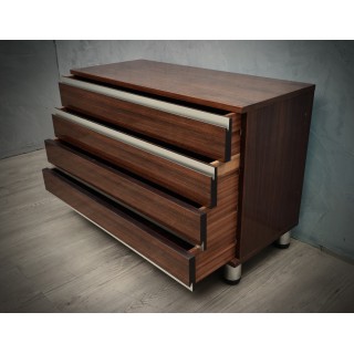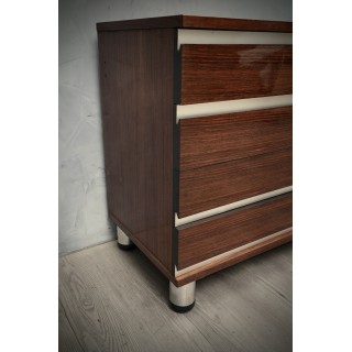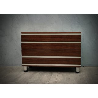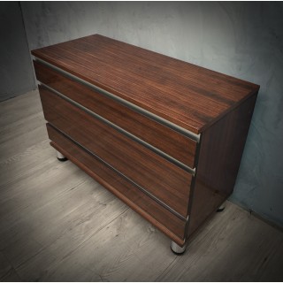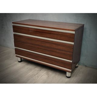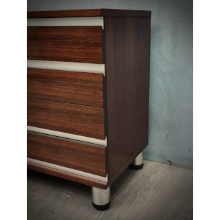 The commode is in walnut wood, with particular aluminum finishes. It has four drawers, well finished and polished. It has been completely re-polished, and has a beautiful patina.