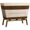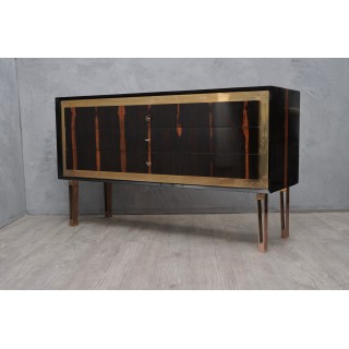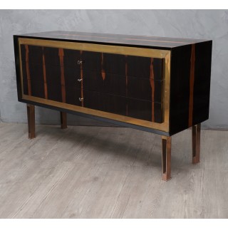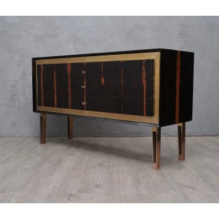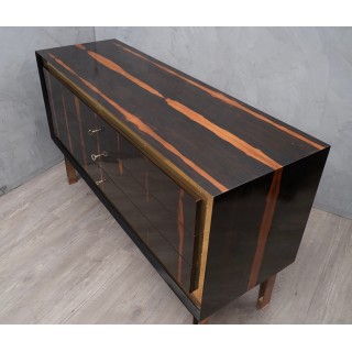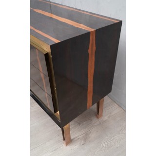 Body all veneered in Macassar wood, with a beautiful brass frame on the front which borders the drawers. These are three, narrow and long, and can be opened by a key positioned at their center. The sideboard is raised by four legs, in brass frame. To note the Macassar wood veneer positioned longitudinally to the dresser.