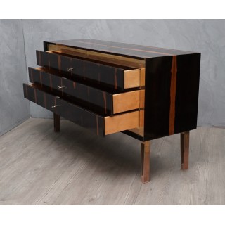 Splendida cassettiera lastronata in legno di ebano e ottone. Provenienza Italia. Epoca 1940. Cm (150x48, H 87). Inches (59 x 19, H 34).