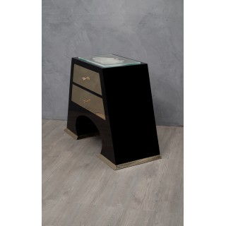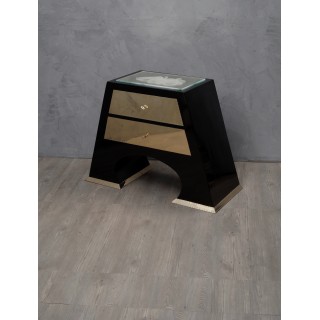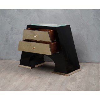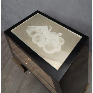 The chest of drawers is composed of a polished body with black shellac, in which there are two drawers, whose fronts are covered with a polished brass plate; hey can be opened using a brass key. But let's get to the beauty, above the chest of drawers it has a glass about a centimeter high, in which a figure of a woman in the clouds is sanded, taken from a drawing of "Gio Ponti"; excellent its execution. Finally the chest of drawers has feet also covered with a brass plate and nailed. Its shape is very particular and very beautiful. Misure Cm ( 120 x 48, H85), Inches (47 x 19, H 33).