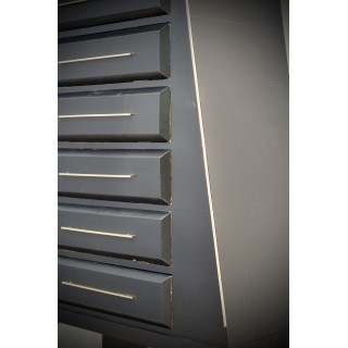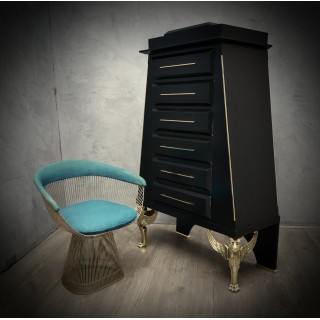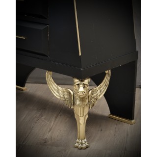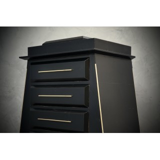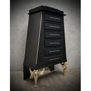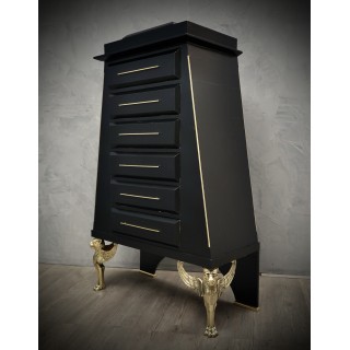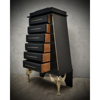 The dresser has a wooden body covered in goatskin which was then colored black. The structure is reminiscent of an Egyptian pyramid, to which brass finishes have been added along the edges. The six drawers can be opened by means of brass handles, applied along the entire front of the drawer. The front of the drawer, as can be seen from the photos, comes out from the body of the dresser, in order to create a movement on the front of the dresser. The rear legs are made of wood and have small brass feet, while the front legs are made of brass, representing two lions' heads with wings. Misure Cm ( 100 x 50, H 158). Inches (39 x 20, H 62).