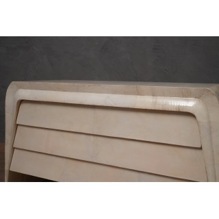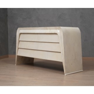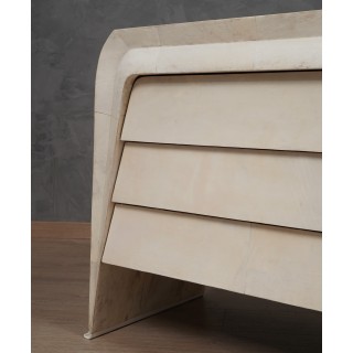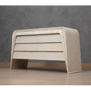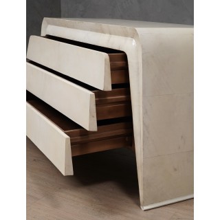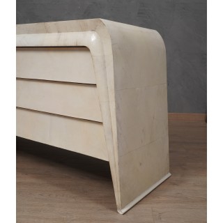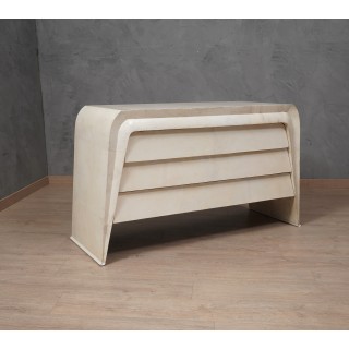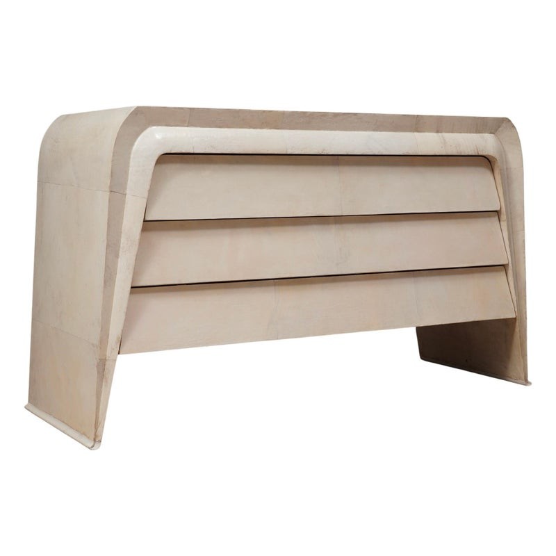 La cassettiera ha un design molto particolare, il suo piano che curva e scende formando il fianco e poi le gambe; Il piano presenta una fascia con una particolare lavorazione che prosegue stringendosi fino alla base delle gambe. Nel corpo centrale sono presenti tre cassetti, questi hanno il frontale inclinato e non hanno maniglie; i cassetti si possano aprire mettendo la mano lungo il bordo inferiore. Il comò è completamente rivestito in pergamena, che ha mantenuto una bella patina, ed è stata poi lucidata molto bene. Misure ( 143 x 52, H 32 ) Inches ( 56 x 20, H 37 ).