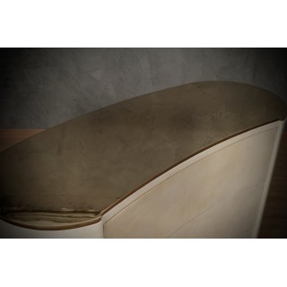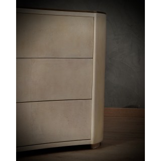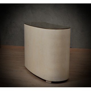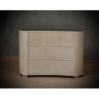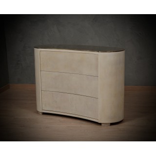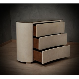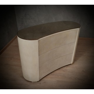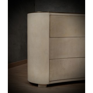 La cassettiera ha un design molto particolare, la sua forma arrotondata permette alla cassettiera di essere posizionata sia lungo una parete che al centro di una stanza, essendo rifinita anche nella parte posteriore. Ci sono tre cassetti, che possono essere aperti premendo sul frontale del cassetto. La parte anteriore del cassetto ha una forma convessa. Il piano è rivestito in ottone con una leggerissima fascia di un centimetro lungo tutto il suo perimetro. I lati sono quindi arrotondati e finiscono a terra. Misure ( 120 x 47, H 85 ) Inches ( 47 x 18, H 33 ).