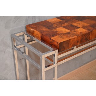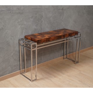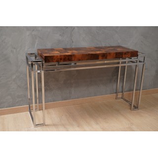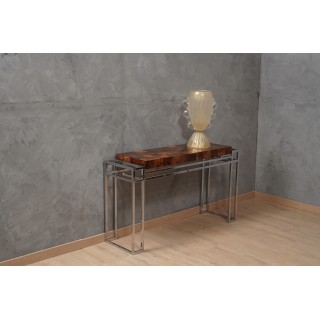 The console is composed of a chromed metal structure, with a very particular design, formed by a series of intersecting rectangles that form the leg. Above there is a top formed by a wooden panel of pleasant thickness and covered with precious wood that forms a squared design; the wooden top is placed inside a chromed metal structure. A piece of furniture that will surely dress perfectly the wall where it will be placed. The console is very clean and the architecture of its design is very original. The wooden top of the console is completely veneered with a precious briar. Elegant and pleasant, the console is brilliant in its design. Misure ( 135 x 39, H 77 ) Inches ( 53 x 15, H 30 ).