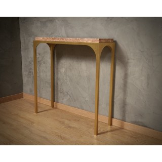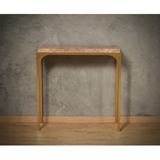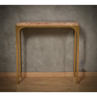 The console is composed of a protected matt brass structure, with a very particular design, formed by a simple and linear brass structure. Above is a wooden top covered with a very precious "broccatello di spagna" marble of light pink color. A piece of furniture that will surely dress and perfectly enhance the wall where it is placed. The console is very clean and the architecture of its design is very original. Elegant and pleasant, the console is brilliant in its design. Misure ( 92 x 30, H 94 ). Inches ( 36 x 12, H 37 ).