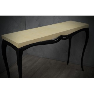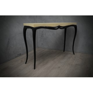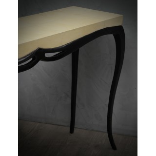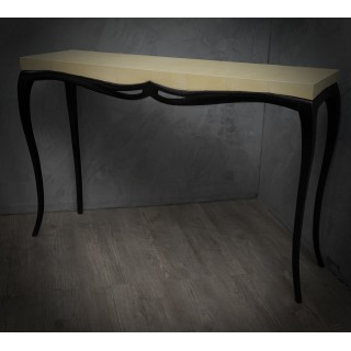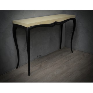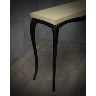 The console is made up of a wooden top covered in goatskin, where the leather also covers the part of the side edge; The top rests on a frame in beech wood polished in black lacquer, moved to form a small acute angle in the centre. This richly shaped top is positioned on a structure that gives shape to a frame and four legs. Four long saber legs raise it from the ground, also in black lacquered beech wood. To note the movement of the frame on the front of the console, very beautiful and particular. (Cm 138x38, H 90).