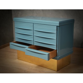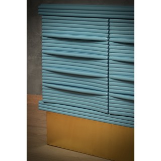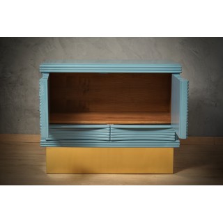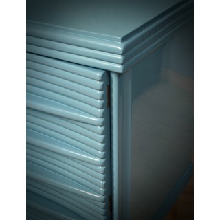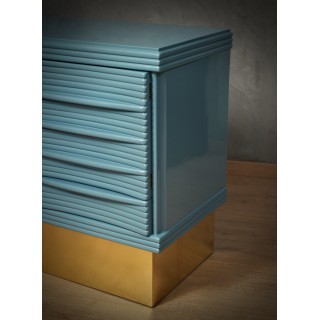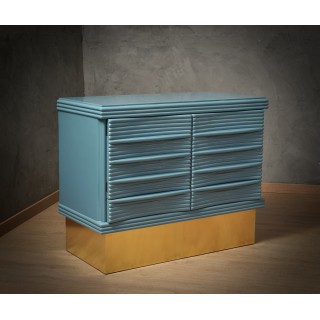 The sideboard has a simple wooden structure, enriched by a beautiful ribbed workmanship of the doors. Internally it is very spacious, as you can see from the photos, note that in the lower part there are two drawers, one on each side. The smooth and well-polished top has a very beautiful color, it is the same KittiWake color by Farrow&Ball; same thing for the sides of the sideboard. As for the front of the sideboard, however, we have a wonderful ribbed workmanship to create a geometric play. The sideboard is raised from the ground by a wooden band covered in fine brass. Misure ( 110 x 51, H 88 ). Inches ( 43 x 20, H 35 ).