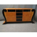 All veneered in ash wood and polished details in black shellac. Sideboard composed of three doors, two side ones that give access to two discrete compartments and a central one that opens frontally which with two side compasses give the door the possibility of remaining as a support surface. The manual processing of this door frontally is very beautiful; formed by rich acute angles positioned in series. Around the two side doors small black frames are positioned, as well as on the four long legs that raise the sideboards from the ground.