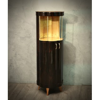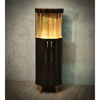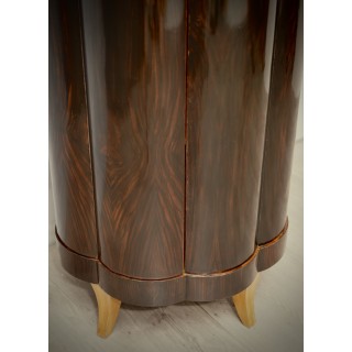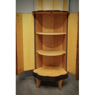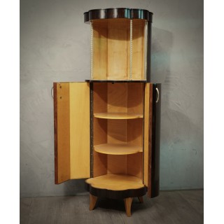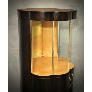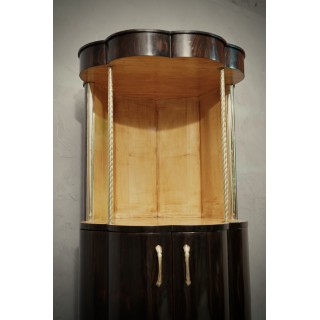 The cabinets is completely veneered in walnut wood, while on the inside it is finished in maple wood. In fact the combination of the two colors is very nice. Important to note that its base is round but not regular, rather to form a kind of daisy along the perimeter. So the body of the cabinet is not smooth, but going upwards it forms a wavy movement. In the upper part, the wavy movement stops and forms an open compartment, for a vase a lamp or a sculpture to be inserted. Two small brass columns finish the entrance. Two brass handles allow the opening of the doors in the lower part of the cabinet, a pair of shelves is inserted internally.