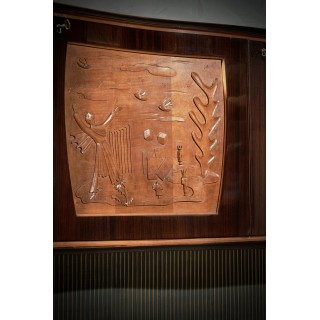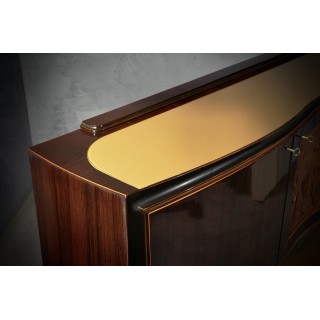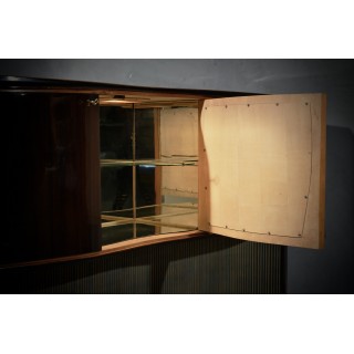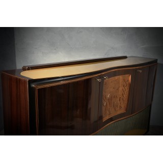 All veneered in walnut wood. Top in gold colored glass, recessed. Three front doors, which follow the movement of the top. The two sides are veneered in walnut, while the central one has only a veneered walnut frame with centrally a carved and worked panel. The sides are smooth and straight. Below there is an empty part, with a glass of the same color as the top, and a wavy movement on the backrest, in green and gold. When you open the central door a light comes on, which illuminates the entire interior, made of mirrors and with a glass shelf. While the inside of the two side doors is veneered in maple wood with a shelf, all well-polished. Finally the central foot has a brass edge at the bottom. Note the entire movement of the piece of furniture that is not flat but wavy. Cm (200x50, H 118). Inches (79x20, H46).