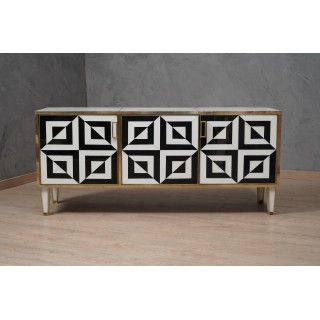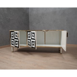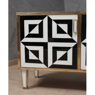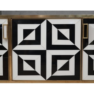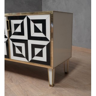 The sideboard has a wooden structure with three beautiful very wide doors. The structure was completely covered in white glass and then finished with brass moulding. As for the doors, on the other hand, they were used to cover the black and white glass, also to obtain the gap that can be seen in the photos. Even internally the sideboard has been covered in white glass. Elegant and original sideboard of its kind, spacious and well finished internally. The play obtained with the black and white glass on the front doors is very eccentric. Misure ( 161 x 45, H 73 ) Inches ( 63 x 18, H 29 ).