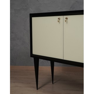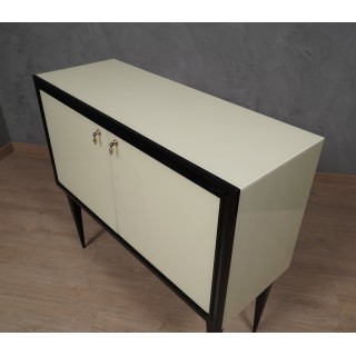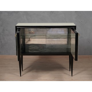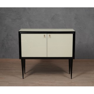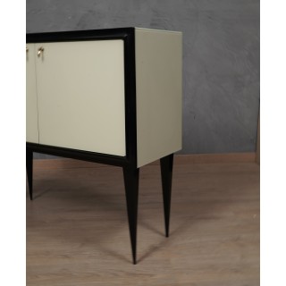 The sideboard has a wooden structure, which has been covered with cream colored glass. Frontally, the sideboard has a black frame that has been placed all around the two doors; these can be opened using two special brass pendant handles. The body of the sideboard rests on four legs in black lacquered wood. The design of the legs is very elongated and narrow in the final part that touches the ground. Internally the sideboard is covered with a micro mosaic mirror, a very peculiar feature for sideboards from the 1950s. The mirrors are also present on the inside of the doors, further embellishing the sideboard. Internally there is a small shelf, while a black glass has been positioned in the lower part. Misure ( 110 x 41, H 100 ) Inches ( 43 x 16, H 39 ).