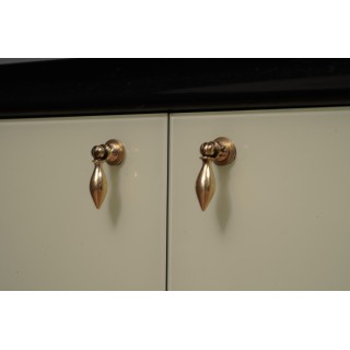La credenza ha una struttura in legno, la quale è stata rivestita con dei vetri color crema. Frontalmente la credenza presenta una cornice nera che è stata posta tutta intorno ai due sportelli; questi possono essere aperti tramite due particolari maniglie in ottone. Il corpo della credenza poggia su quattro gambe in legno laccato nero. Il design delle gambe è molto allungato e stretto nella parte finale che tocca terra. Misure ( 110 x 41, H 100 ) Inches ( 43 x 16, H 39 ).