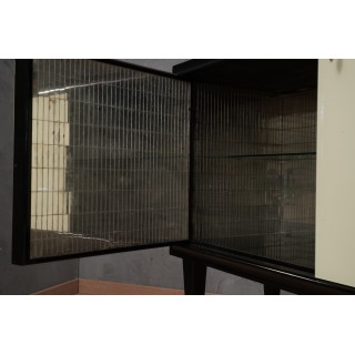 Una credenza unica nel suo genere per originalità e per la scelta dei materiali. Design semplice ma raffinato, la parte interna è completamente rivestita con piccoli specchietti, un vero mosaico in miniatura. Da notare il ricco design delle ante, con vetri lisci colorati contornati da una cornice laccata nera.