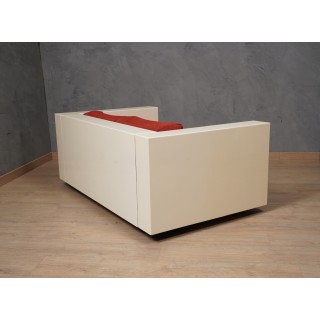 Il divano è composto da una serie di moduli in legno laccato bianco uniti insieme, con cuscini in tessuto rosso. Studiato nei minimi dettagli, il suo design è lineare e semplice ma accoglie perfettamente e comodamente la seduta di una persona. Misure ( 150 x 90, H 60/40 ) Inches ( 59 x 35, H 24/16 ).