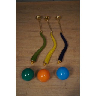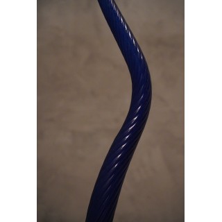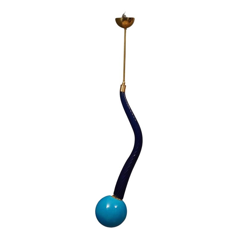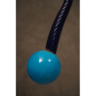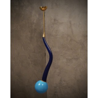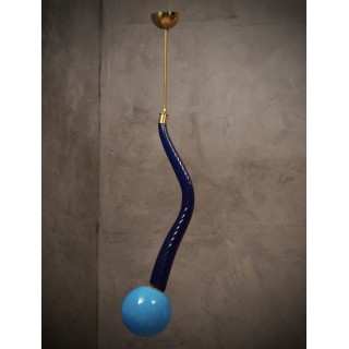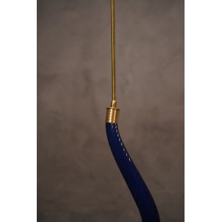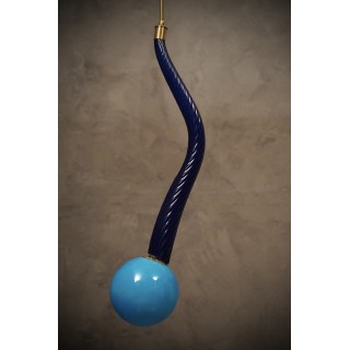 La lanterna è composta da uno stelo centrale in vetro di Murano curvato “torcion”, di dimensioni e spessore importanti, soffiato a mano. Nella parte inferiore di questo stelo in vetro è stata inserita, tramite un attacco in ottone, una sfera in vetro in tinta; la quale sfera porta internamente una lampadina con un piccolo portalampada. Alla parte superiore dello stelo in vetro è fissato un sottile tubo di ottone lucido che ne permette poi il fissaggio al soffitto. Misure ( diametro 20, H 130 ). Inches ( diameter 8, H 51 ).