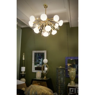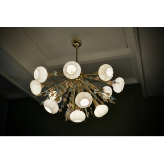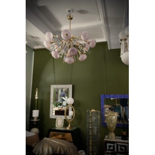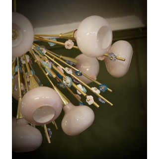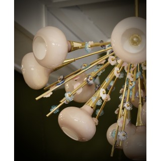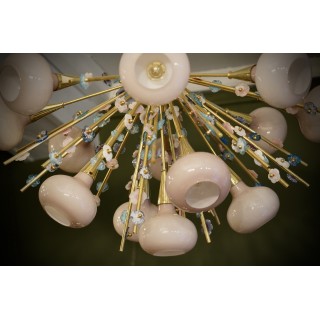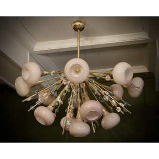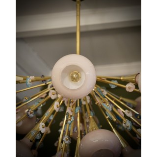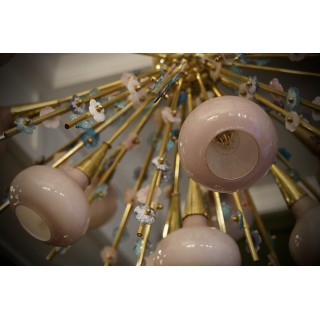 Il lampadario ha la forma di un mezzo "sputnik", composto da una semisfera centrale in ottone sulla quale sono alloggiate delle aste in ottone sulle quali sono avvitati piccoli fiori in vetro di Murano di molteplici colori. Molto particolare la lavorazione di queste aste in ottone con attaccati questi fiorellini in vetro. Ha tredici luci, ogni luce è coperta da una campana di vetro rosa. Misure ( diametro 100, H 90 ). Inches ( diameter 39, H 35 ).