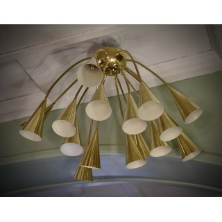 The chandelier has the shape of a half "sputnik", composed of a central brass hemisphere on which are housed foldable brass tubes at the end of which carry a brass cone. The small brass tubes are like the arms of an octopus, they can be moved depending on how a person wants the light. It has sixteen lights. Internally the cones, where the bulbs are housed, are painted white. Simple but very elegant. Refinement and style as in the Italian style of the 70s, unique pieces that always remain precious. When turned on, the chandelier is very bright, having sixteen bulbs with small lamp holders, it will illuminate your home perfectly. Misure ( diametro 90, H 60 ). Inches ( diameter 35, H 24 ).